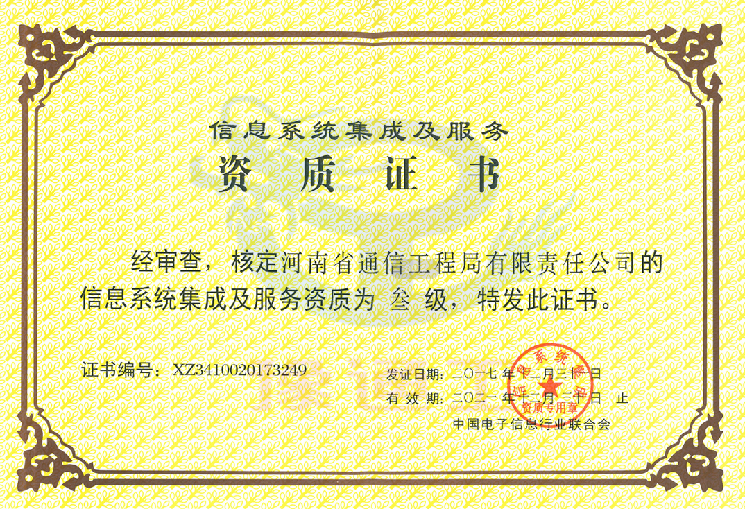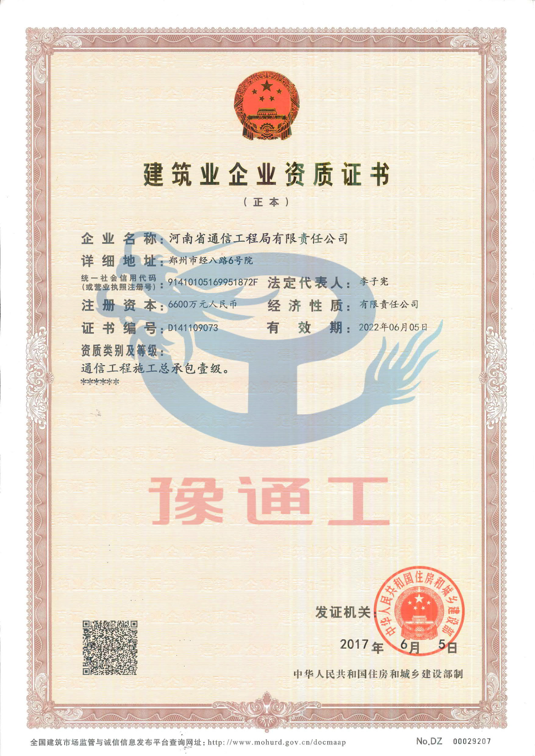 電子與智能化、建筑裝修裝飾、消防設施工程專業承包壹級;鋼結構工程專業承包貳級;建筑工程、電力工程、機電工程、城市及道路照明工程專業施工總承包叁級;施工勞務不分等級。